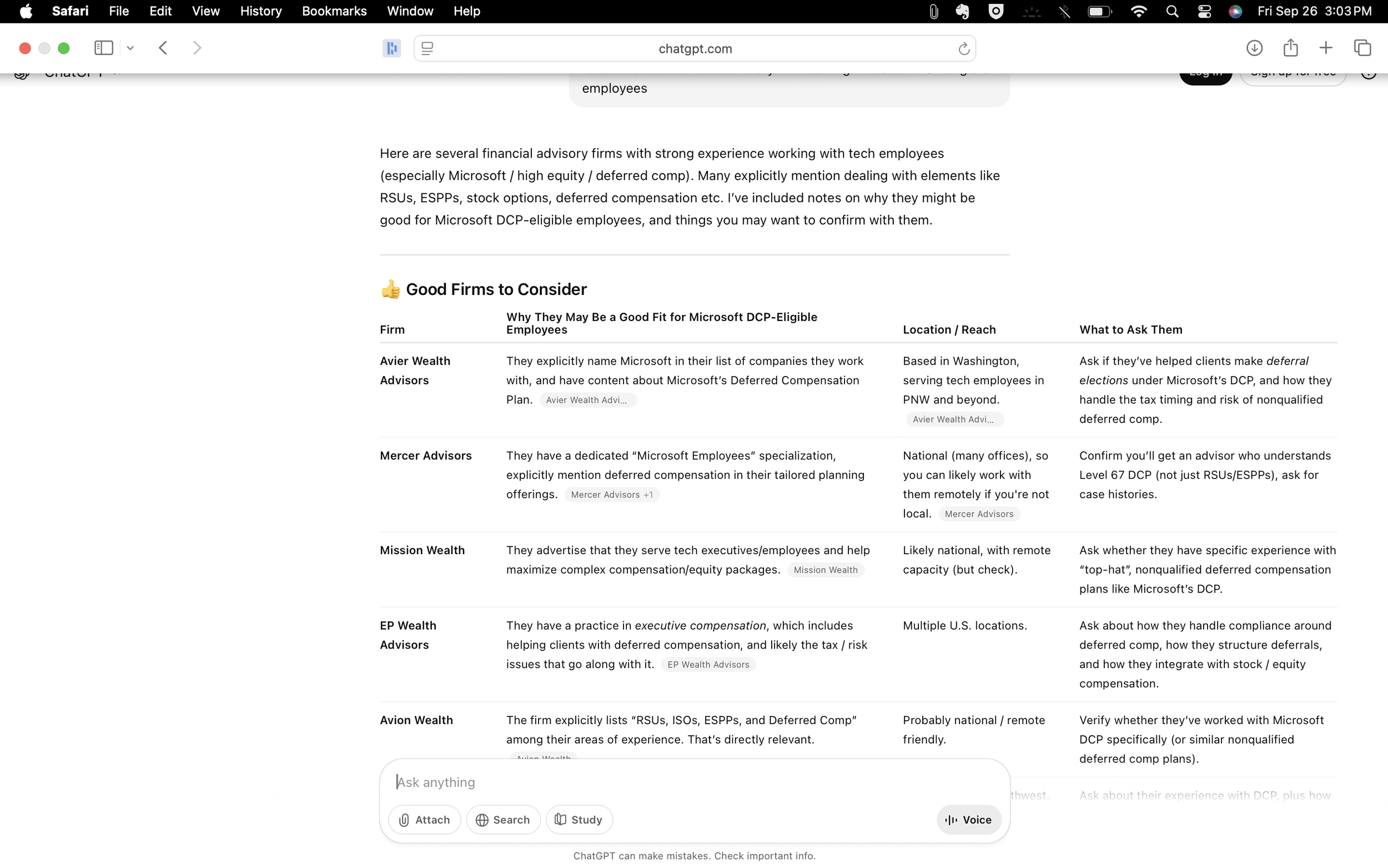 ChatGPT: Good Firms to Consider for Microsoft DCP-eligible employees financial advice - Avier Wealth Advisors is #1. 9/26/2025