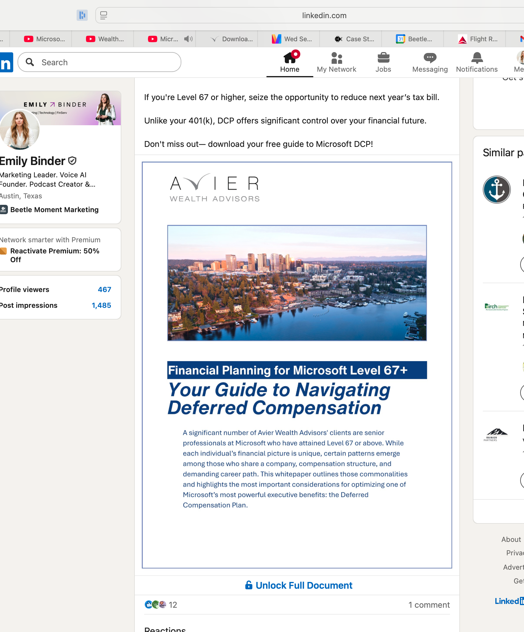 Avier Advisors sought to attract a highly targeted segment of tech industry professionals: Microsoft employees eligible for the Deferred Compensation Plan (DCP). These search terms, such as "Microsoft Deferred Compensation Plan," "Microsoft DCP," and "Microsoft DCP Level 67," represent a lucrative, specialized client base that Avier are deep experts at advising, with over twenty years working in the highly compensated technology employee niche.